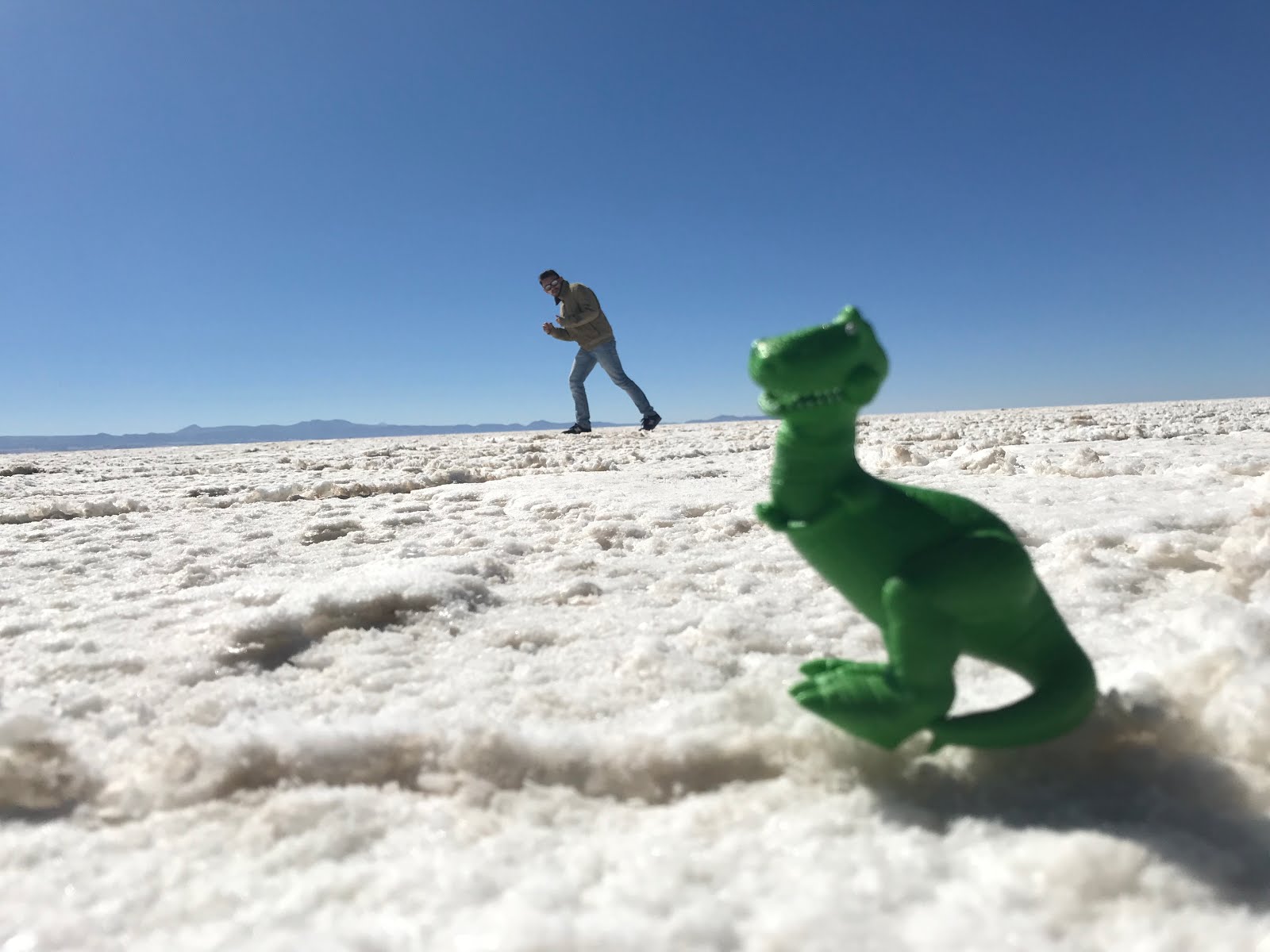 E, enfim, chegou o dia em que chegaríamos ao destino da nossa travessia: o indescritível Salar de Uyuni, o maior deserto de sal do mundo, ocupando uma área de mais de 10 mil quilômetros quadrados e localizado a mais de 3 mil metros de altura. Um deserto que chama a atenção não apenas por sua cor incrivelmente branca mas também pelo incomparável nivelamento da sua superfície, permitindo aquelas famosas fotos em perspectiva que 10 em cada 10 turistas tiram quando chegam ao deserto.