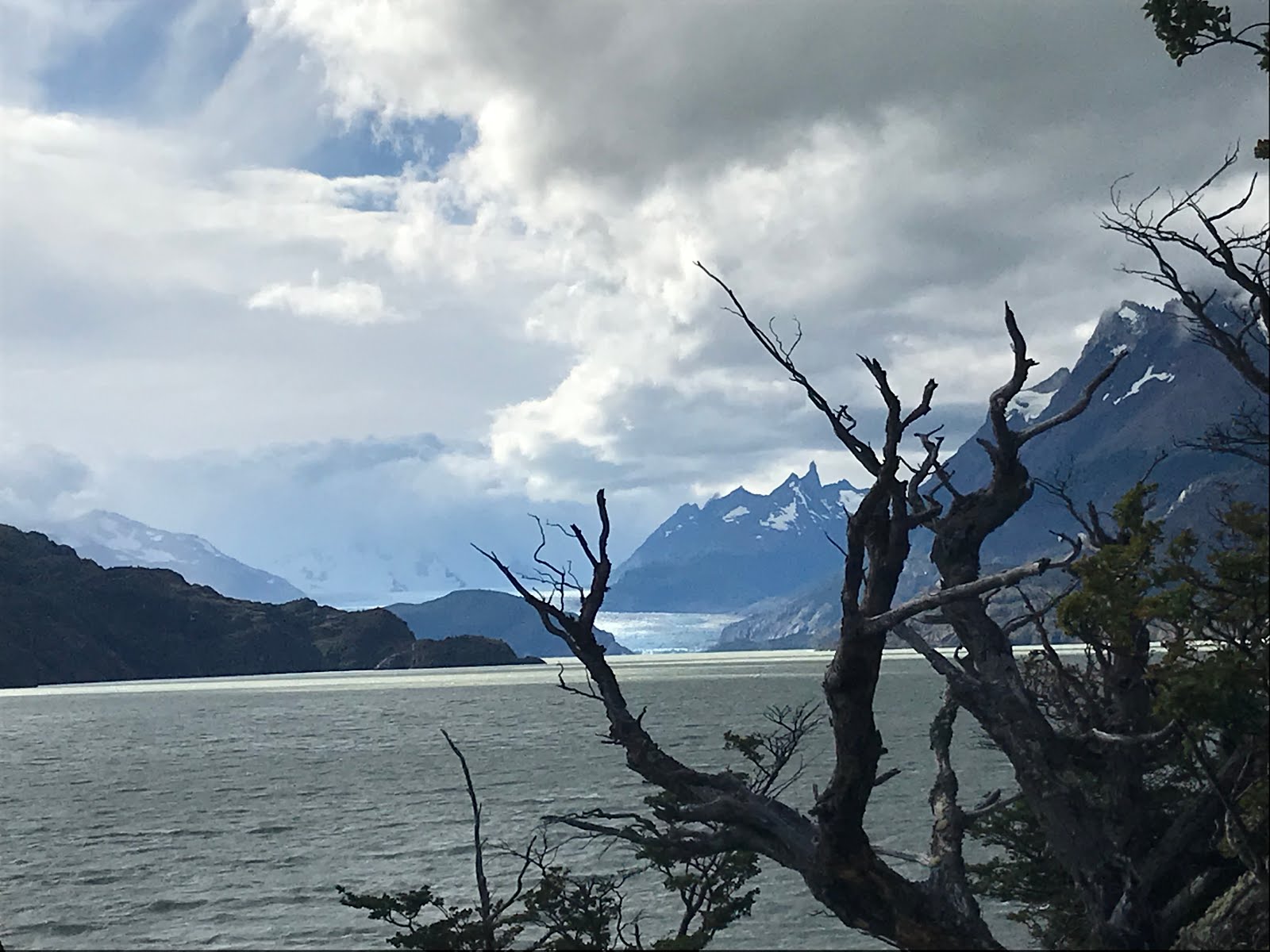 Durante o trajeto pela encosta, vamos vendo o Glaciar Grey e vamos percebendo as inúmeras árvores queimadas no incêndio que devastou o parque em 2011 (fruto da irresponsabilidade de um turista). Afinal, o fogo teve início na margem leste do Lago Grey.